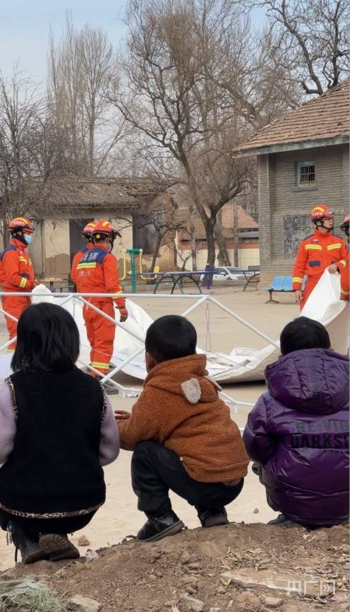 在消防救援人员搭建帐篷的同时,四堡子村里的孩子三五成群,在广场周围的土坡上驻足观察。不远处,还有几个孩子在打乒乓球,相互追逐嬉戏的孩子们不停地穿梭在消防救援人员的身边,搭建的工作依然井然有序,不受影响。