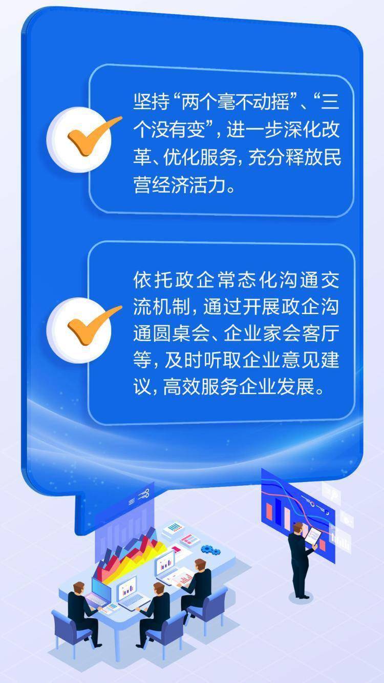 在优化支持帮扶上下功夫。加大惠企政策集成供给力度,开展欠款清理、减税降费专项行动,促进民营企业降本减负、扩产增效。支持民营企业与科研机构、高校等合作建立创新平台,发挥科技创新重要作用。健全民营企业培育库,培育一批民营“专精特新”企业。弘扬新时代企业家精神,推进高素质民营企业家队伍建设,选树一批优秀民营企业和民营企业家。