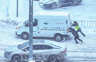 12月21日,在山东省荣成市成山大道一处路口,执勤交警在协助推车(无人机照片)。受强冷空气影响,连日来,山东省多地迎来持续大范围降雪天气。(新华社发)