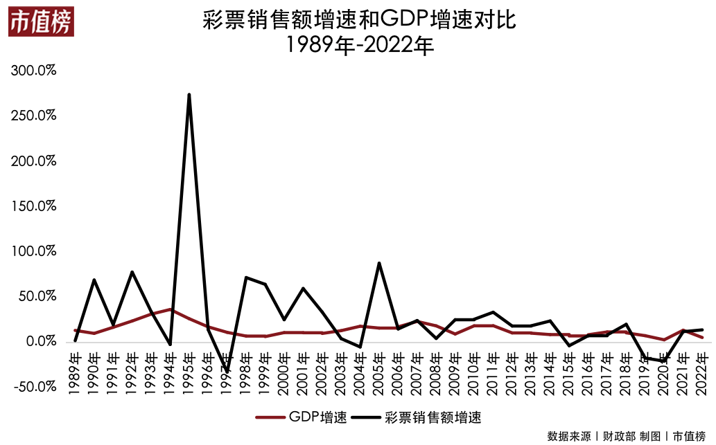中国彩票销售额从1990年的6.47亿增长到2022年的4246.52亿,同期GDP也从1.9万亿增长到121万亿。