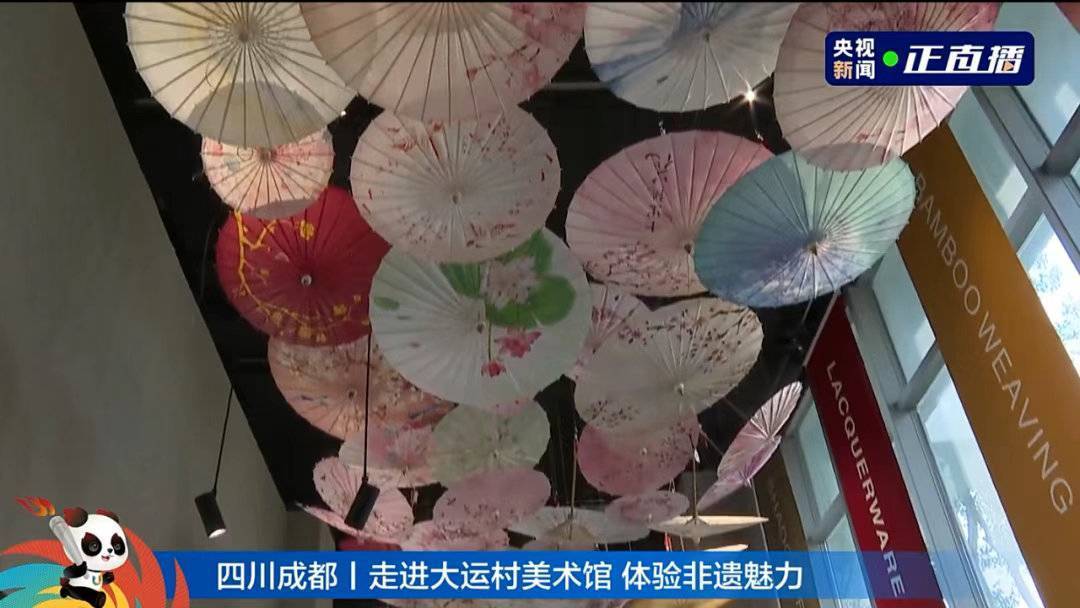 成都大运会运动员村,来自泸州的非遗分水油纸伞等亮相。图片来源 央视