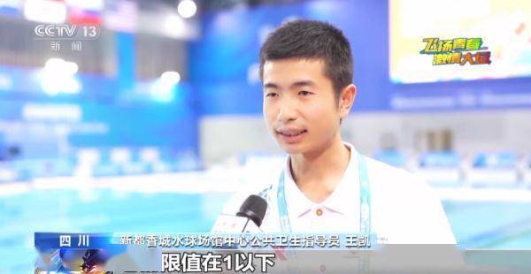 新都香城水球场馆中心公共卫生指导员 王凯:游泳池最重要的两个指标就是游离余氯和浑浊度。比如泳池水质浑浊度的指标,限值在1以下,数值越小越清澈。