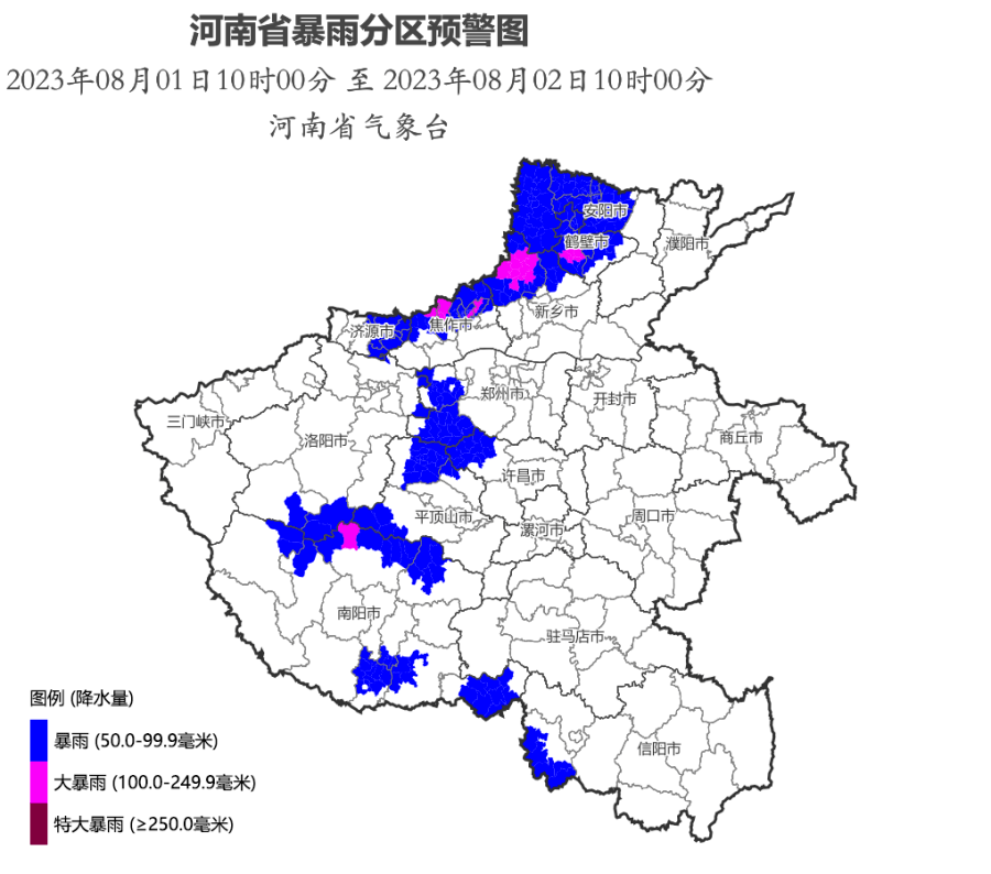 据河南气象局预报,8月1日10时至2日10时, 安阳西部、鹤壁西部将出现分散性暴雨,其中鹤壁、新乡西部、焦作北部、南阳北部局部大暴雨(100-130 、新乡西部、焦作、济源、郑州西部、洛阳南部、平顶山北部和南部、许昌西部、南阳北部和南部、信阳毫米),伴有雷电、短时强降水(最大小时雨强40-60毫米)、短时大风等强对流天气。请密切关注属地气象部门发布的最新预报信息和气象灾害预警信号,做好防范应对工作。上述地区的相邻县市(区)也需关注。