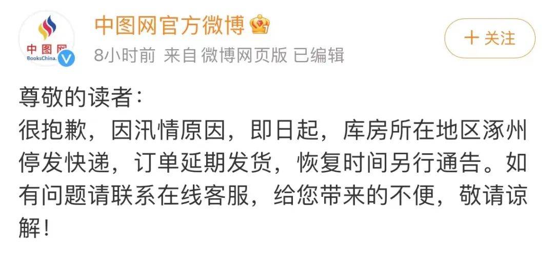 8月1日,@中图网官方微博发布消息称,因汛情原因,即日(8月1日)起,库房所在地区涿州停发快递,订单延期发货,恢复时间另行通告。