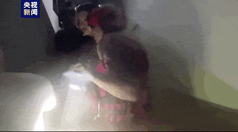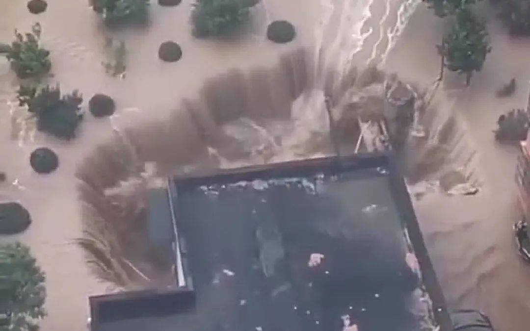 ▲河北涿州水尚佳仁小区地库出现塌方,洪水不断涌入。 网络视频截图