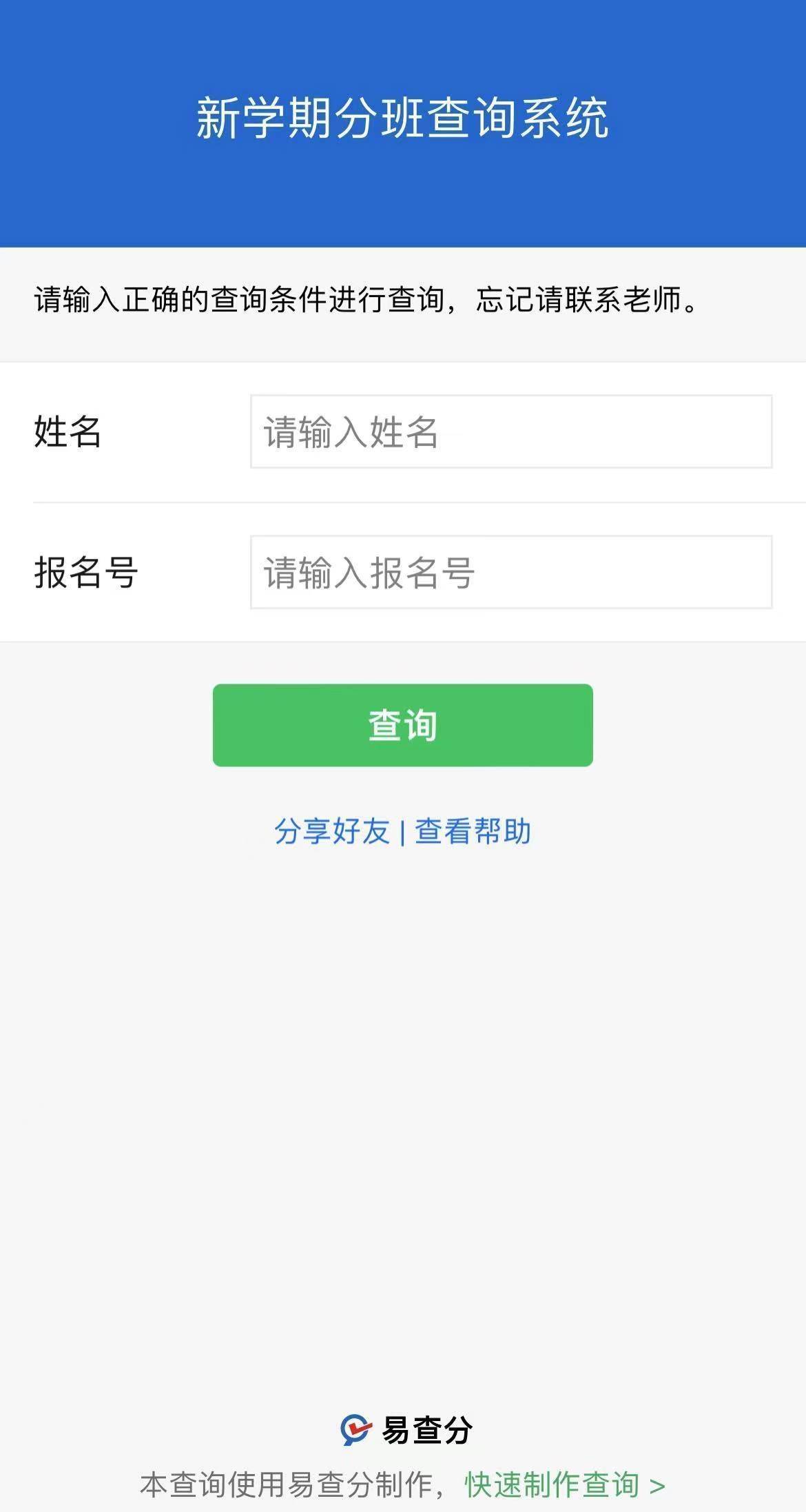 完成上述设置,点击提交并生成查询按钮,分班查询系统就制作好啦!学生打开查询页面就能看到如下查询界面: