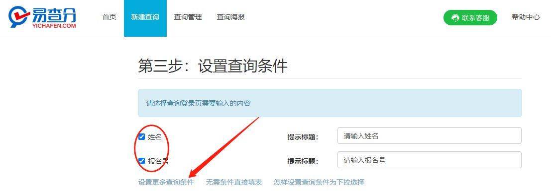 选择需要学生验证的查询条件,易查分会自动识别可以作为查询条件的列;如需设置其他查询条件,请点击【设置更多查询条件】进入设置;