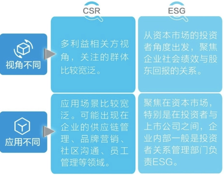 比如,两者面向对象是不同的,前者大多面向公众,而后者主要面向资本市场,有专业的评级和衡量体系;前者强调企业对社会的回馈,不涉及业务层面,后者强调公司商业价值与社会价值的统一;再比如,CSR相对属于非强制行为,ESG的强制趋势则日益明显。
