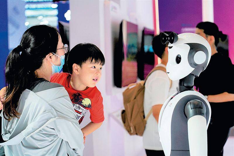 参观者在上海举行的2023世界人工智能大会上与柔美人形智能服务机器人互动(2023年7月6日摄) 李心怡摄/本刊