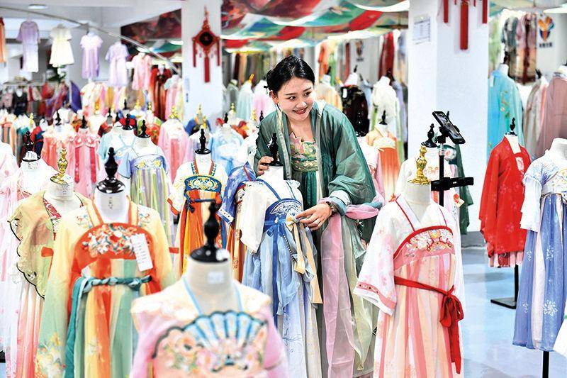 在山东省曹县安蔡楼镇有爱云仓汉服基地,女主播直播推介儿童汉服(2023年7月6日摄) 郭绪雷摄/本刊