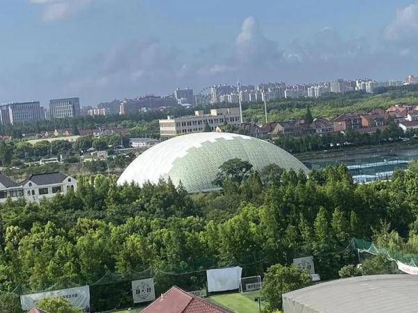保利叶之林小区位于塘祁路华秋路,小区北面正对着祁连公园,再往前就是蕰藻浜,网球纪体育公园就在河浜边上。因为没有高大的遮挡物,从小区2楼以上望出去视野一览无余,可以很清晰看到河边有一个高大的建筑物,球体外表用类似白色塑料膜覆盖,表面光滑,在阳光的照射下闪闪发光。只要盯着球体表面注视超过一分钟,眼睛就会感到刺痛。