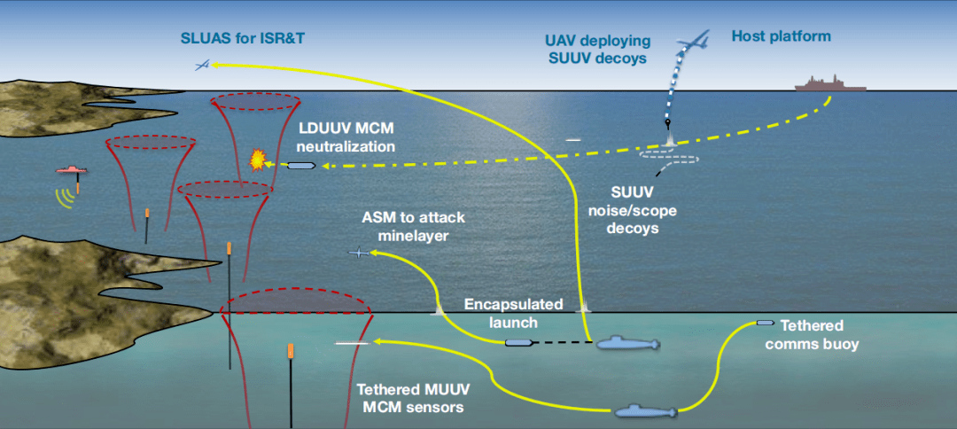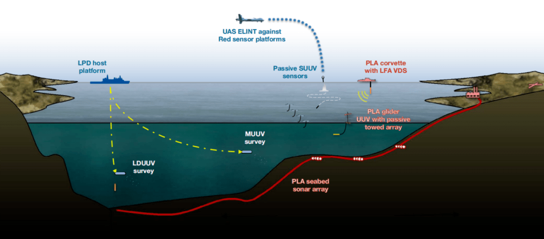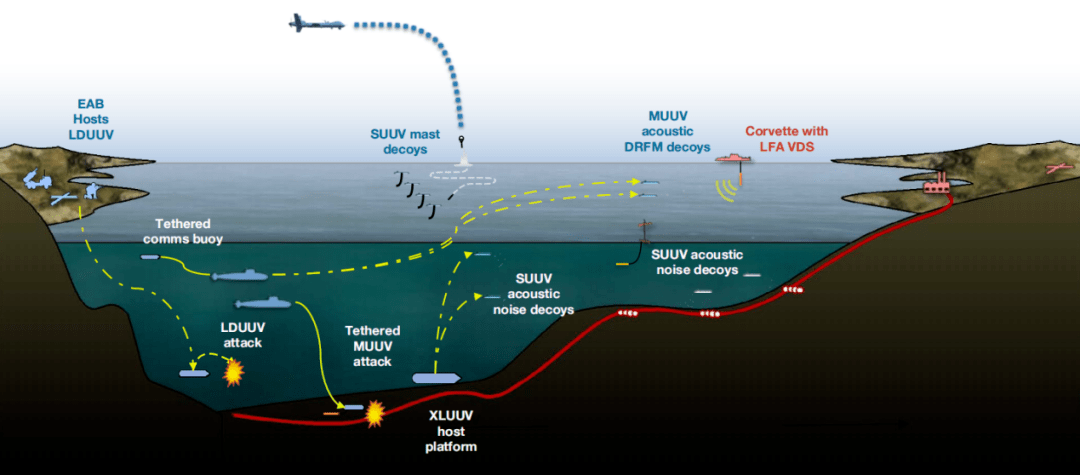 对抗任何一个对手的水下防御系统都需要生成数十个虚假的潜艇目标,干扰可能的数百个传感器,摧毁数十个网络节点。图2展示了美军可以用来压制或摧毁敌人水下防御的一些方法。
