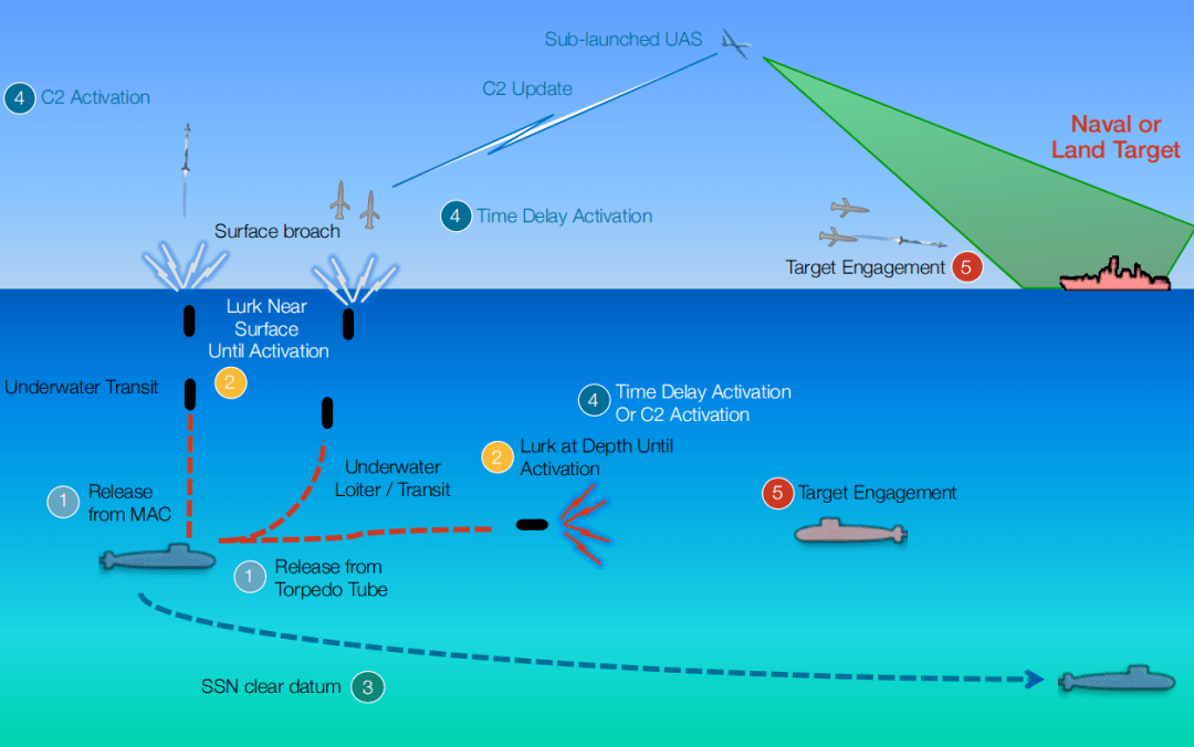 无人机将留在该地区处理MAC现场数据,并将其传递给管理反潜作战行动的P-8A反潜机。该飞机可以指挥一架或多架带有LFA VDS系统的无人艇,以跟踪敌方潜艇。当敌方潜艇对美国海军陆上部队或设施构成威胁时,P-8A反潜机通常会与威胁潜艇交战,并且无人机可以使用小型鱼雷或深水炸弹压制潜艇行动,迫使它们脱离并离开该海域。