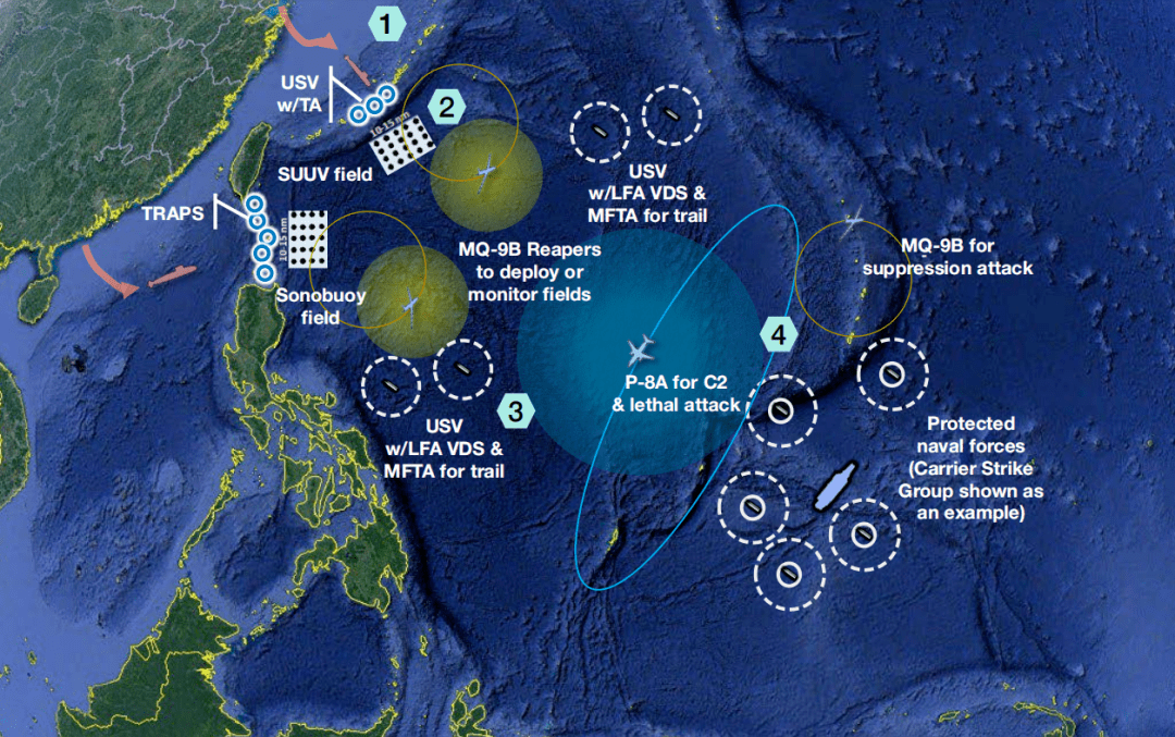 哈德逊研究所之前的一项研究提出了一种新的反潜作战方法,通过使用无人平台执行大部分的反潜探测和跟踪任务,可以扩大反潜作战行动,并且降低对有人平台的需求以及其可能面临的风险;有人平台将专门用于指挥控制和交战。该研究提出的总体概念如图3所示。在这个概念中,固定的无人传感器,如“可靠声学路径转换系统”(TRAPS)或装备有拖曳式被动声纳阵列的无人艇,将沿着敌方潜艇可能行驶的海上咽喉区域进行屏障搜索。