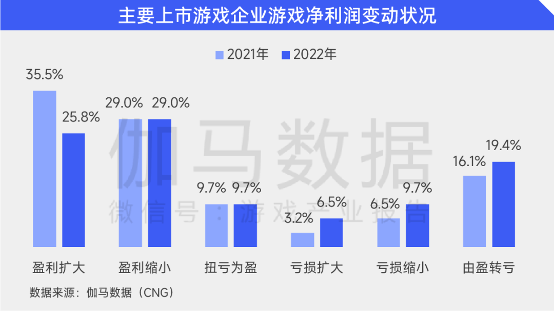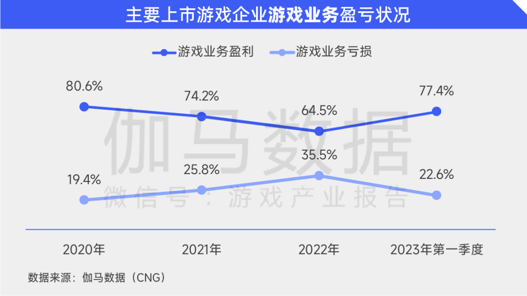 在净利润方面,营销效果下滑较为明显,2022年监测企业中游戏业务的亏损占比升至35.5%,保持盈利的企业中也更多出现盈利下滑。进入2023年,盈利状况虽有好转但亏损企业仍超2成。
