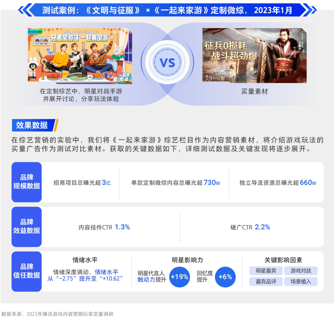 综艺与游戏的联动营销,基于明星效应对玩家的情绪提振效果显著(+19%),且能够进一步强化游戏的品牌回忆度(+6%)。