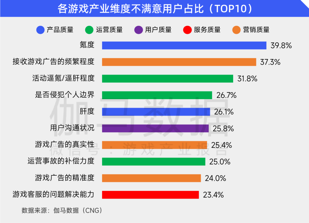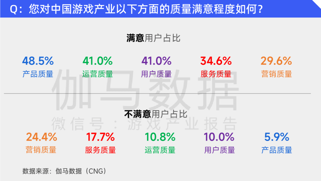 数据显示,营销质量是用户最为不满的领域,对其满意的用户占比仅高出不满意用户5.2个百分点。不满的主要原因在于,用户期望获得与基于广告产生的想象画面一致的游戏体验,例如真实的游戏画面,又如宣传内容为核心玩法而非次要玩法。但部分产品为提升获客效果,存在过度夸大甚至虚假宣传的现象,一定程度透支用户信任,进而造成营销质量的用户满意度最低。