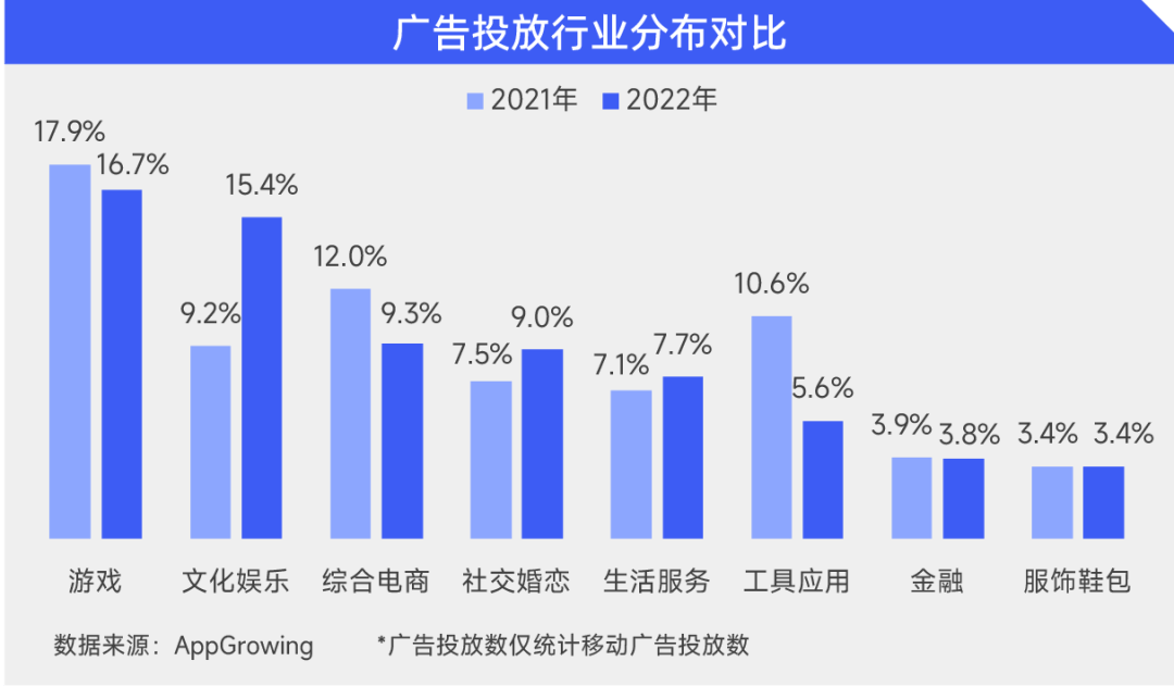 2022年由游戏产业投放的移动广告数量占整体的16.7%,同比下降1.2个百分点,游戏产业在异业竞争中仍然保有优势但优势有所减弱。
