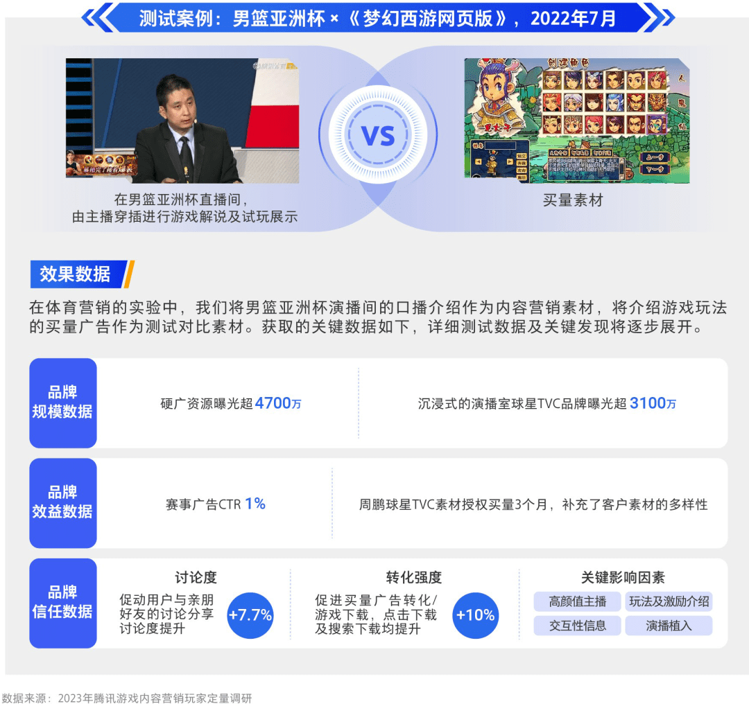 体育与游戏的联动营销,能够在玩家转化层面产生显著影响,有效提升玩家讨论度(+7.7%)、下载及搜索意愿(+10%)。