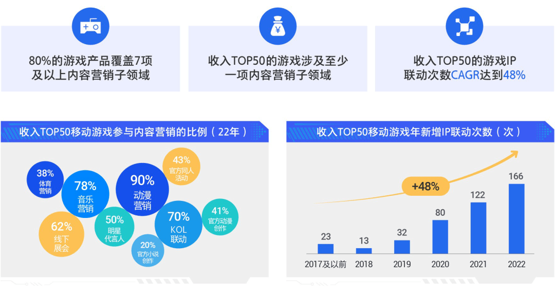 市场调研发现,近年来更多广告主布局内容营销领域,营销类型呈现多样化趋势,且数量显著上升。以IP联动为例,收入TOP50移动游戏的营销领域涵盖餐饮、影视综艺、文博文旅等众多行业,且联动次数复合增长率达48%。