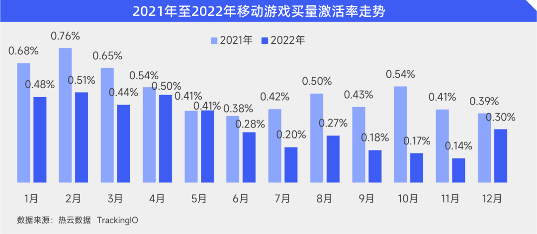 移动游戏的买量激活率持续降低,2022年最低达0.14%,仅为同期的3成。