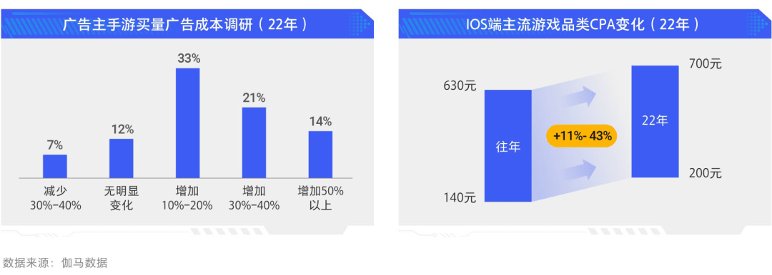 针对效果广告的CPA的统计分析显示,2022年IOS端主流游戏品类的买量成本大多分布在200-700元之间(往年买量成本均值约为140-630元)。如策略游戏,2022年获客成本约350元,RPG游戏获客成本超200元,各游戏品类的买量成本始终维持在高位。