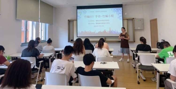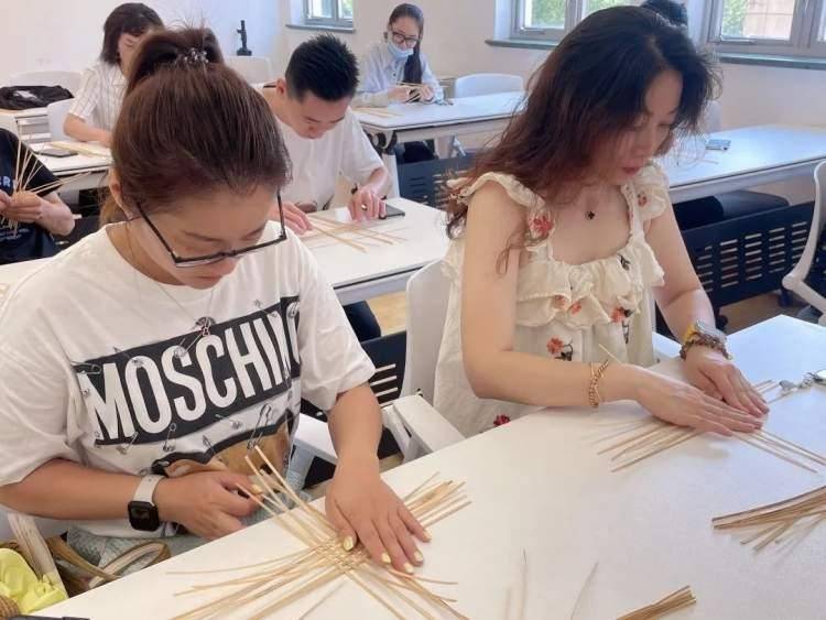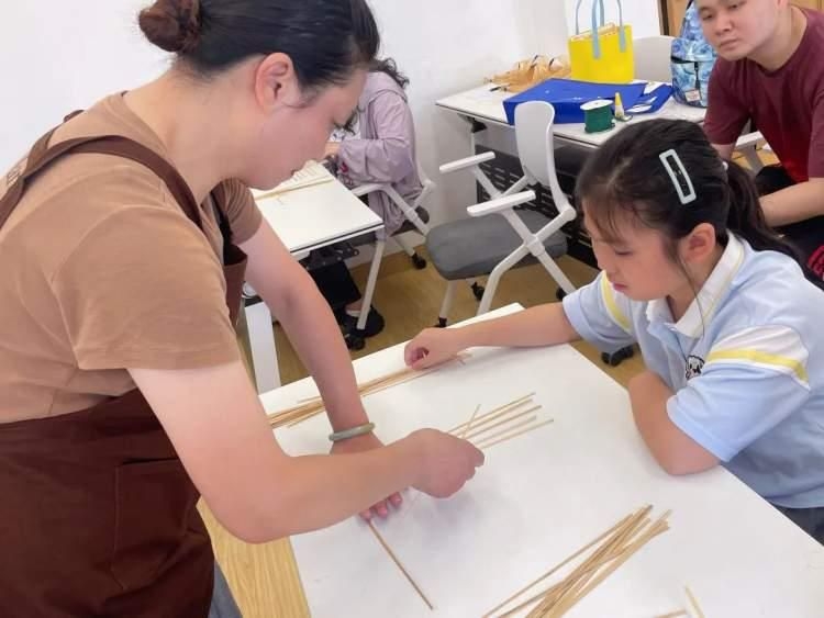 活动开始,志愿者老师一边展示竹编作品,一边向大家介绍竹编的发展历史、文化底蕴、日常应用以及传承意义。手指一抬一压,彰显出传统工艺的魅力。小小月亮船,是手工艺人的匠心独运,更是传统竹编艺术的魅力绽放。在志愿者手把手指导下,大家将竹篾以挑和压的方法构成经纬交织,编织成作品的初步框架。