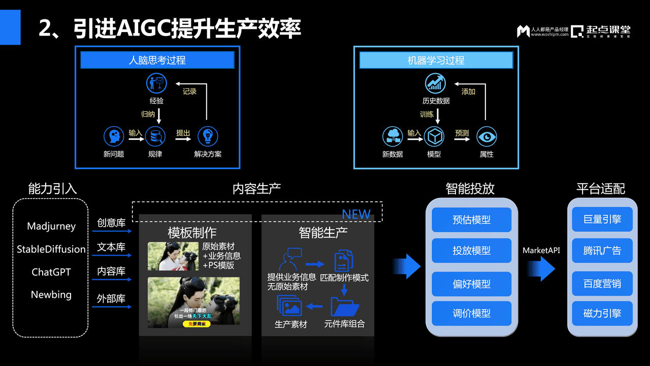 举个例子,广告投放时,很多时候是考察你的创意和你生产创意的过程。广告投放有标题、文案和素材,素材在此之前是要拍摄的,那么我们可以根据想要的prompt去生产图片,并选择一张和想象中比较接近的图片,缩短我们生产创意的过程。