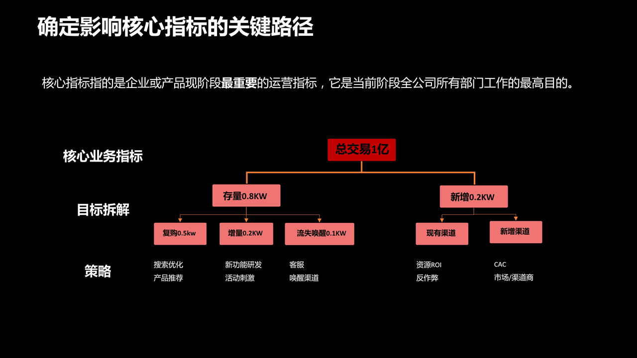 这些关键指标都决定了你的产品、策划、渠道和销售应该向哪个方向拆解,并且拆解到足够细的维度,将其变成一个计算公式。如此,就能把产品的增长目标做得足够量化和细分。