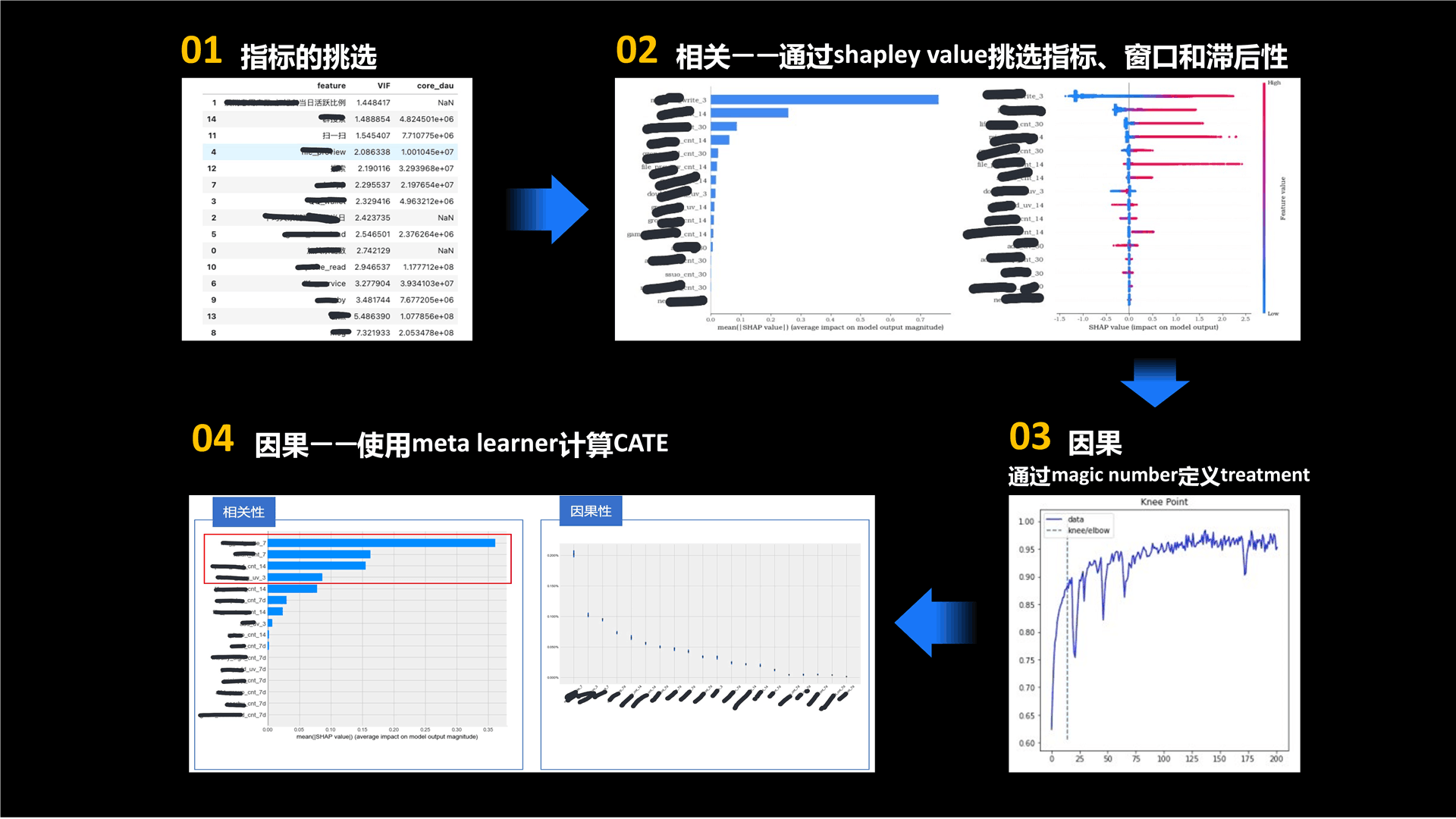 第四,重要度的排序,而后得到了一个因果性的图。横轴是指标的重要度排序,纵轴指的是,每提升指标1%,对应的总指标提升多少。这样,当下面的一堆特征提升多少,就能影响到最终核心指标、长期指标的变化。