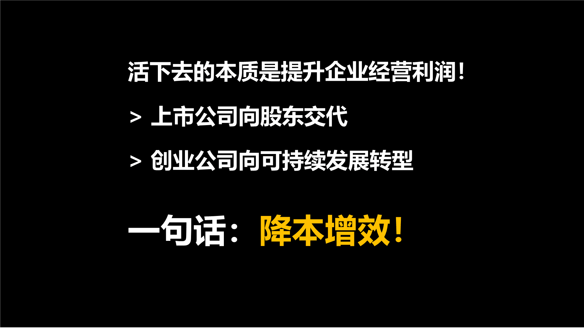我们要做的是降本增效,降本不是目的,增效才是手段。降本增效就是获得增长的可能性,提升收入,降低成本,提升我们未来可发展的潜力和空间。