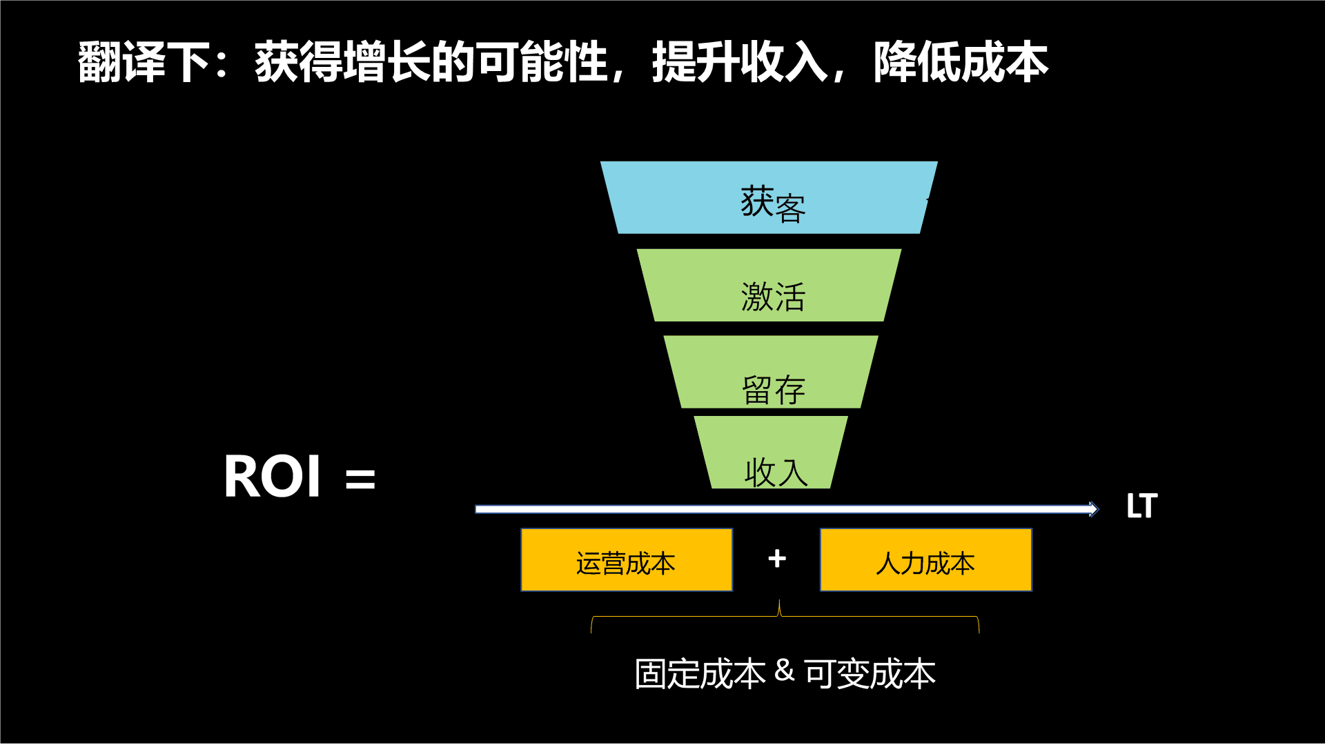 ROI在产品运营,还有活动营销维度都是在不断起作用的。每个产品经理在工作过程中,核心就是在生命周期内让产品尽量变现,并且大于成本。LT就是life time,多长时间之内我们能拿回成本,并且实现更大的ROI提升?这时就需要提升分子、降低分母。分母一般分为固定成本和可变成本,这是经济学里面的两个术语。