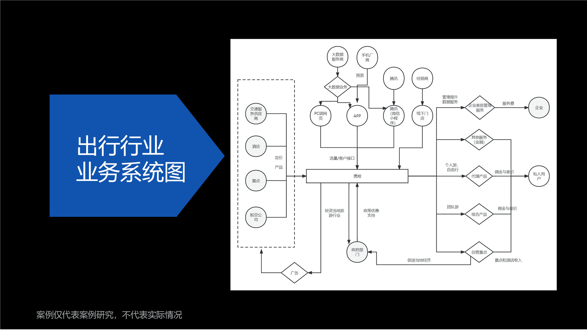 再来看看出行行业的业务系统图。比如它上游承接的是交通服务、酒店以及景点、航空公司。中游比较出色的是大数据业务,以及部分手机厂商去做预装、做增长。同时它有很多官方入口,比如说腾讯的一些小程序、线下门店等。在它的变现空间里,我们可以看到它所做的是酒店景点与用户之间的关联,这也是人场货这一商业模式的体现。