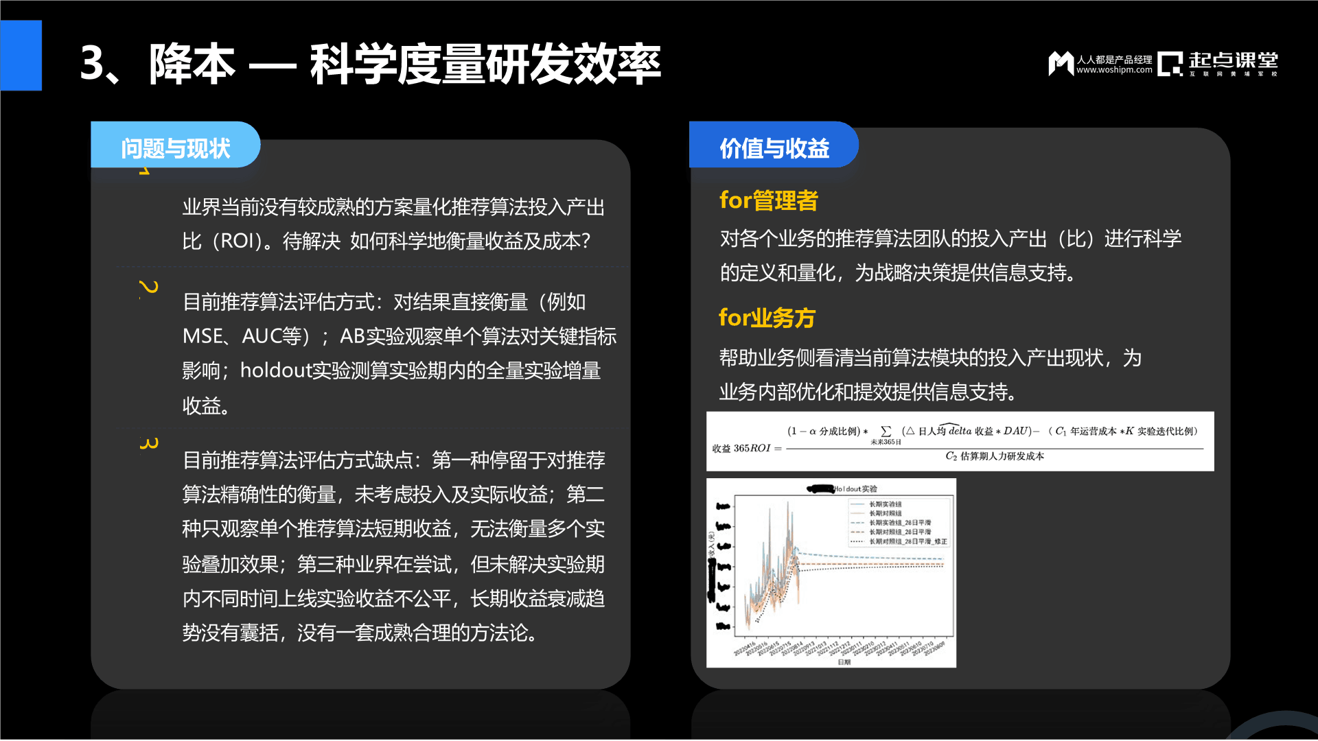 这是站在降本的角度来度量我们的研发效率。前面两个例子是提升买量效率,第三个例子是通过 ROI 度量一切,如果不能度量一切,那么需要往这个方向去靠拢,告诉我们的老板、同学和员工,当前所做的这件事情到底应该如何去评估。