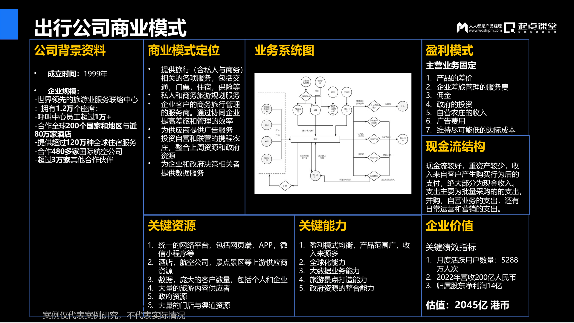 把前面的因素刻画到商业模式里,其实就呈现了一个商业画布,我们可以分析出来这个出行公司在行业内所处的位置。如果每一个竞品公司都做一份类似的图,你就能找出它对应的差距和机会。通过这张图,我们能刻画出来这个企业里当前的主要生产要素,以及它未来的商业发展机会。