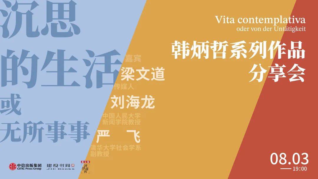 8 月3 日,新京报书评周刊·文化客厅第161 场活动,我们联合中信出版集团、中国建投集团建投书局,邀请传媒人梁文道、中国人民大学新闻学院教授刘海龙、清华大学社会学系副教授严飞共谈韩炳哲系列作品,从韩炳哲的系列作品开始,围绕近期出版的新作《沉思的生活,或无所事事》,聊聊在行动至上的绩效社会里,如何找到属于自己的宁静沉思。