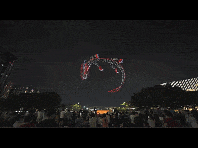 2021年4月,为庆祝韩国某汽车品牌入驻中国,穿越千机在上海外滩上演了创纪录的3281架无人机编队飞行。