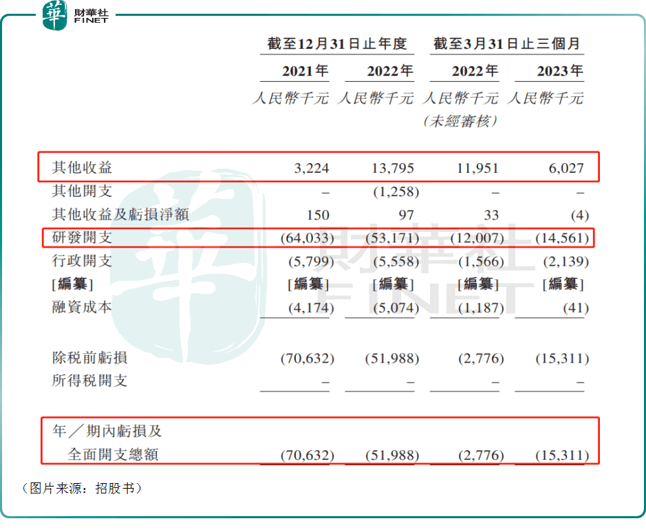 根据招股书,于2021年、2022年及2023年一季度,盛禾生物的亏损及综合开支总额分别为7063.2万元人民币(下同)、5198.8万元、1531.1万元。
