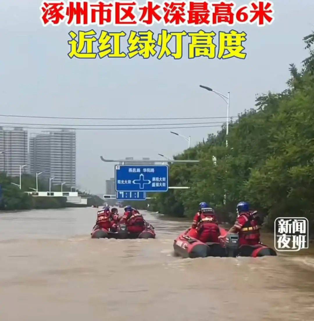 8月2日当天,涿州部分地区的水面几乎与交通指示路牌齐平,积水深度达七八米,最深可达12米。再加上降雨与上游的水流,水位也处于不断变化中,原有的陆路彻底看不见,就连形成的水路也需要救援队时刻观察,有无大型障碍物阻挡或深坑漩涡的形成。