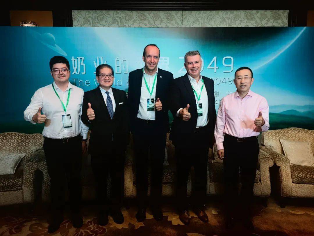 从右至左:蒙牛集团总裁卢敏放,阿拉全球执行副总裁 Simon Stevens,国际乳品联合会(IDF)主席Piercristiano Brazzale,恒天然大中华区首席执行官周德汉(Teh-han Chow),腾讯云副总裁李哲
