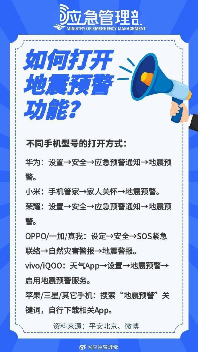 8月6日2时33分,山东省德州市平原县发生5.5级地震,不少网友反馈收到了地震预警。地震预警功能非常重要,在紧急时刻,这提前一分钟的预警,给了我们紧急避险的宝贵时间。那么,手机上怎么设置地震预警?不同手机型号可以参考下面的方法↓↓↓防患于未然,仅需十秒钟,请大家都打开地震预警功能!希望所有人平安!