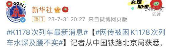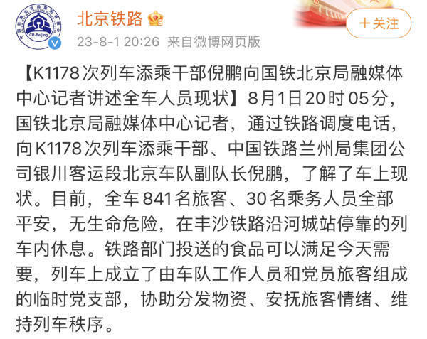 8月1日晚上20点半,北京铁路官方微博发布消息称,K1178列全车841名旅客、30名乘务人员全员平安,无生命危险,投送食品可以满足当天需要。