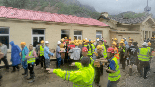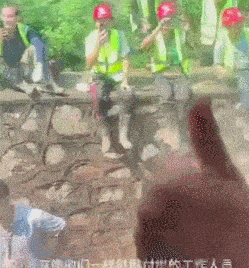 10点半不到,突然有一大群穿着荧光色工作服,戴着黄色头盔的人映入眼帘,他们手提肩扛着水、面包、八宝粥——第一批物资终于送到了!