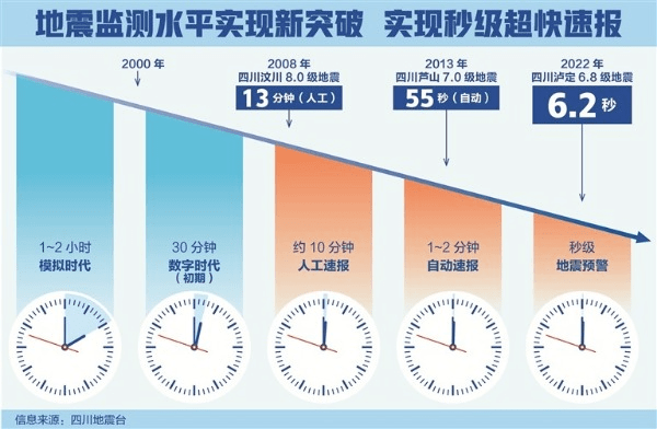 据中国地震局介绍,近年来,我国地震预警信息产出速度不断提升,从约10分钟的人工速报到1至2分钟的自动速报,再到 秒级的地震预警,为抗震救灾提供了强大科技助力。