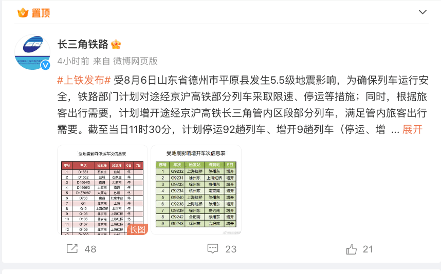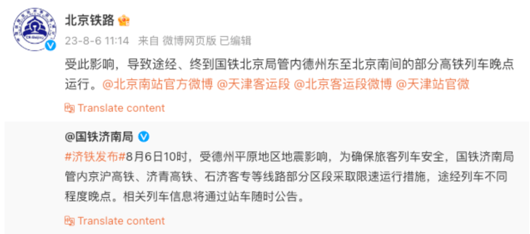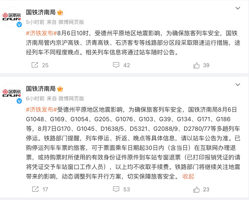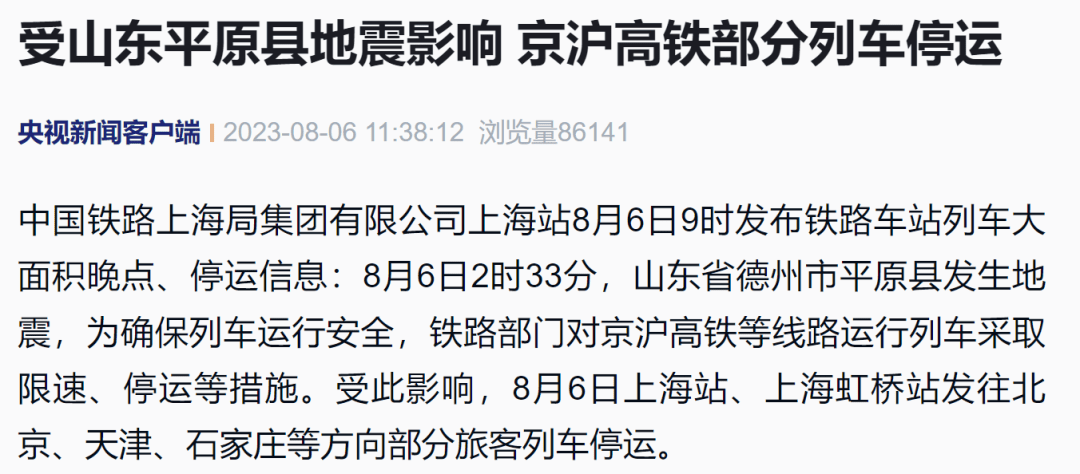 据@北京铁路 消息,8月6日10时,受德州平原地区地震影响,为确保旅客列车安全,国铁济南局管内京沪高铁、济青高铁、石济客专等线路部分区段采取限速运行措施,途经列车不同程度晚点。受此影响,导致途经、终到国铁北京局管内德州东至北京南间的部分高铁列车晚点运行。