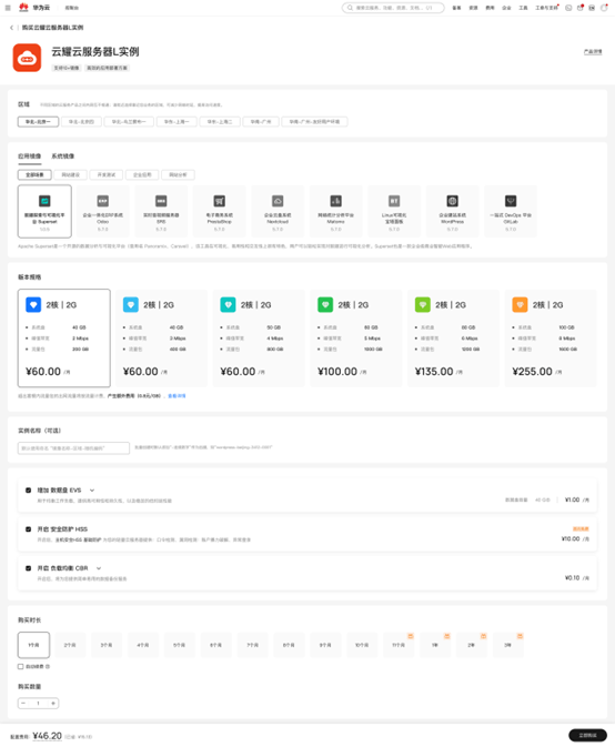 首先,华为云云耀云服务器L实例通过“以用户场景为中心的购买”解决了购买选型技术门槛高,难以理解,决策效率低的问题。它通过用户行业、业务类型、业务规模、SLA等业务诉求,帮助用户进行云服务和解决方案的规格、容量、策略等技术选型;减少用户直接进行技术参数的选型决策。