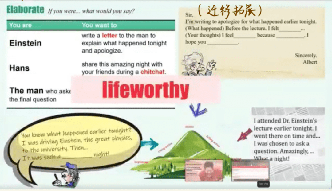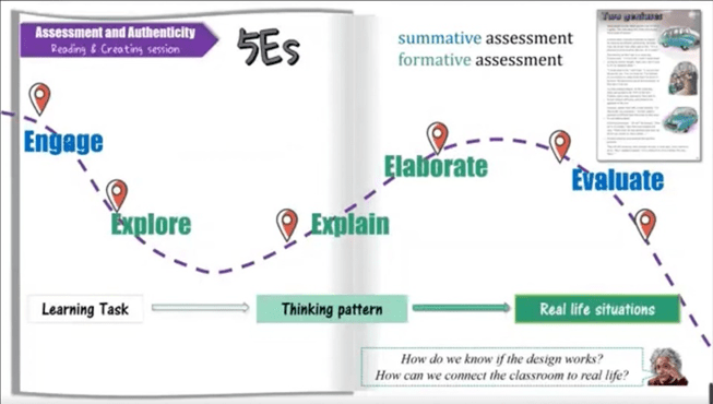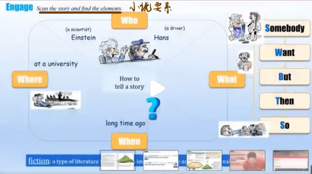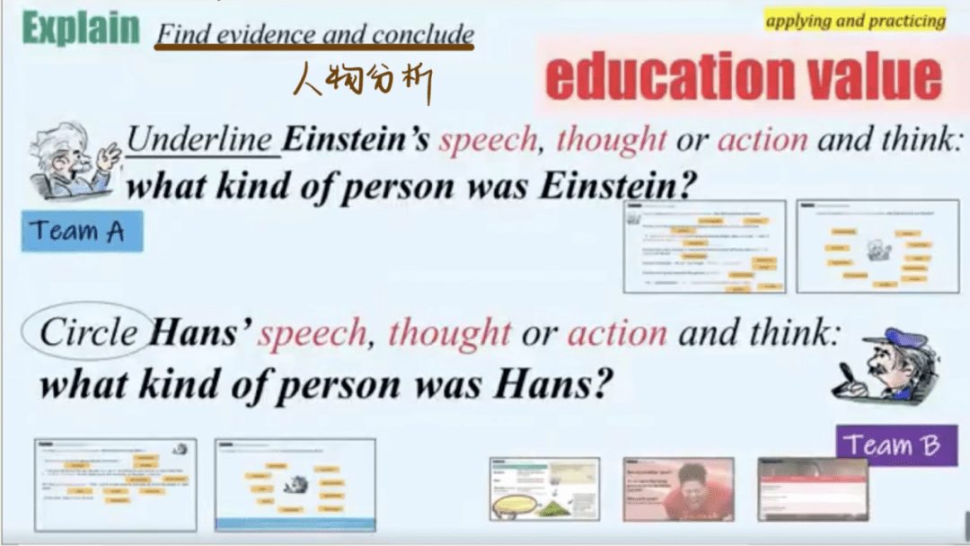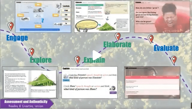 在该阅读课中,教师使用了5E的模式进行环节设计,包括Engage,Explore,Explain,Elaborate和Evaluate,五个关键词实则涵盖了这节课的整体逻辑,由易到难,由浅入深,思维层级逐渐提升,并落实到教学评一体化,具体如下课件展示: