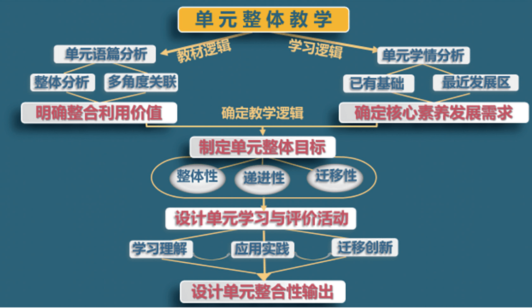 单元整体教学设计是指教师基于课程标准,围绕特定主题,深入解读、分析、整合和重组教材等教学资源后,结合学习主体的需求,搭建起的一个由单元大主题统领、各语篇子主题相互关联、逻辑清晰的完整教学单元(王蔷等,2021)。要有效开展单元教学,教师要明确单元整体教学设计与实施的路径(见下图)。