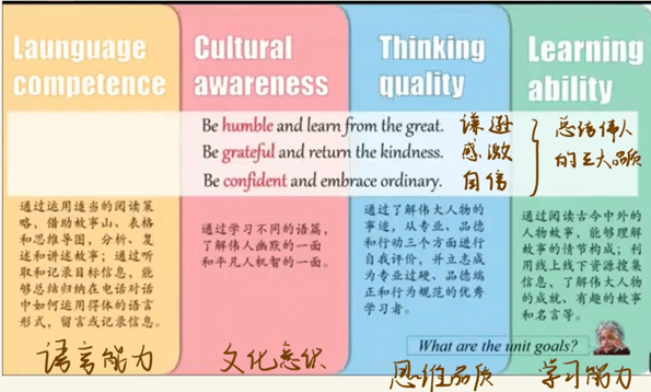 在解说单元整体教学目标时,可以从四大核心素养的维度进行阐释,如本单元分别从四个维度描述主要教学目标,并且提炼出本单元的核心内涵---伟人的三个重要品质:Be humble, be grateful and be confident.