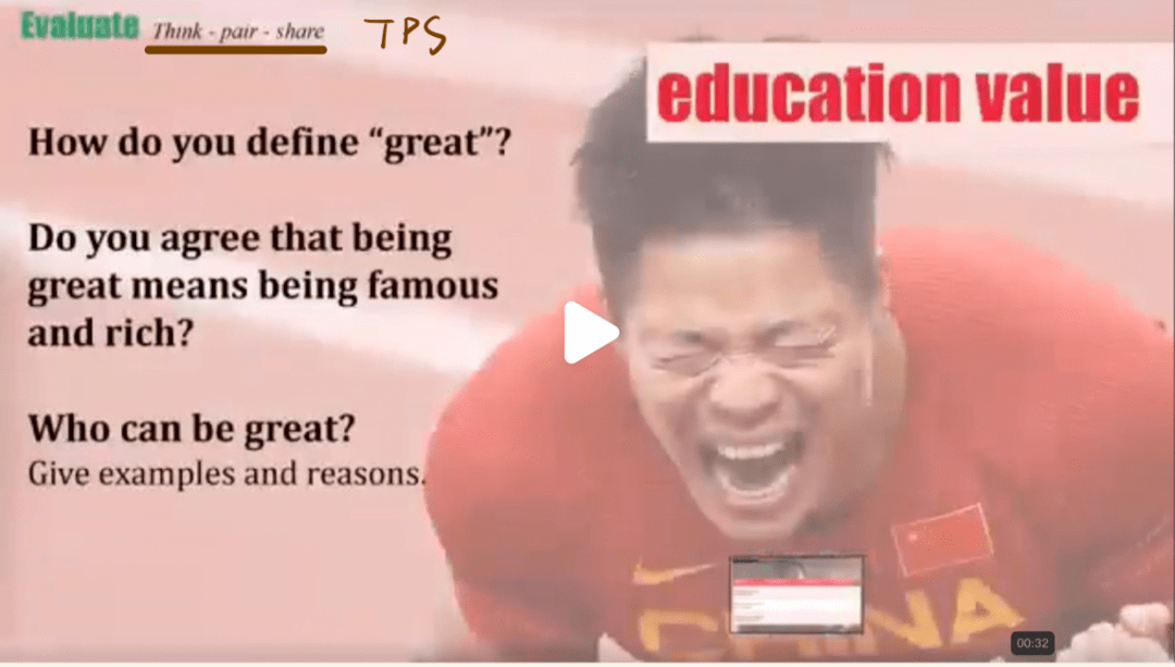 任务五:运用TPR模式(Think-Pair-Share)进行小组讨论分享,挖掘文章中的教育意义,批判性地思考如何界定“Great”,伟大成就与金钱名利的关系以及联系自身实际思考如何成为一名卓越的人。